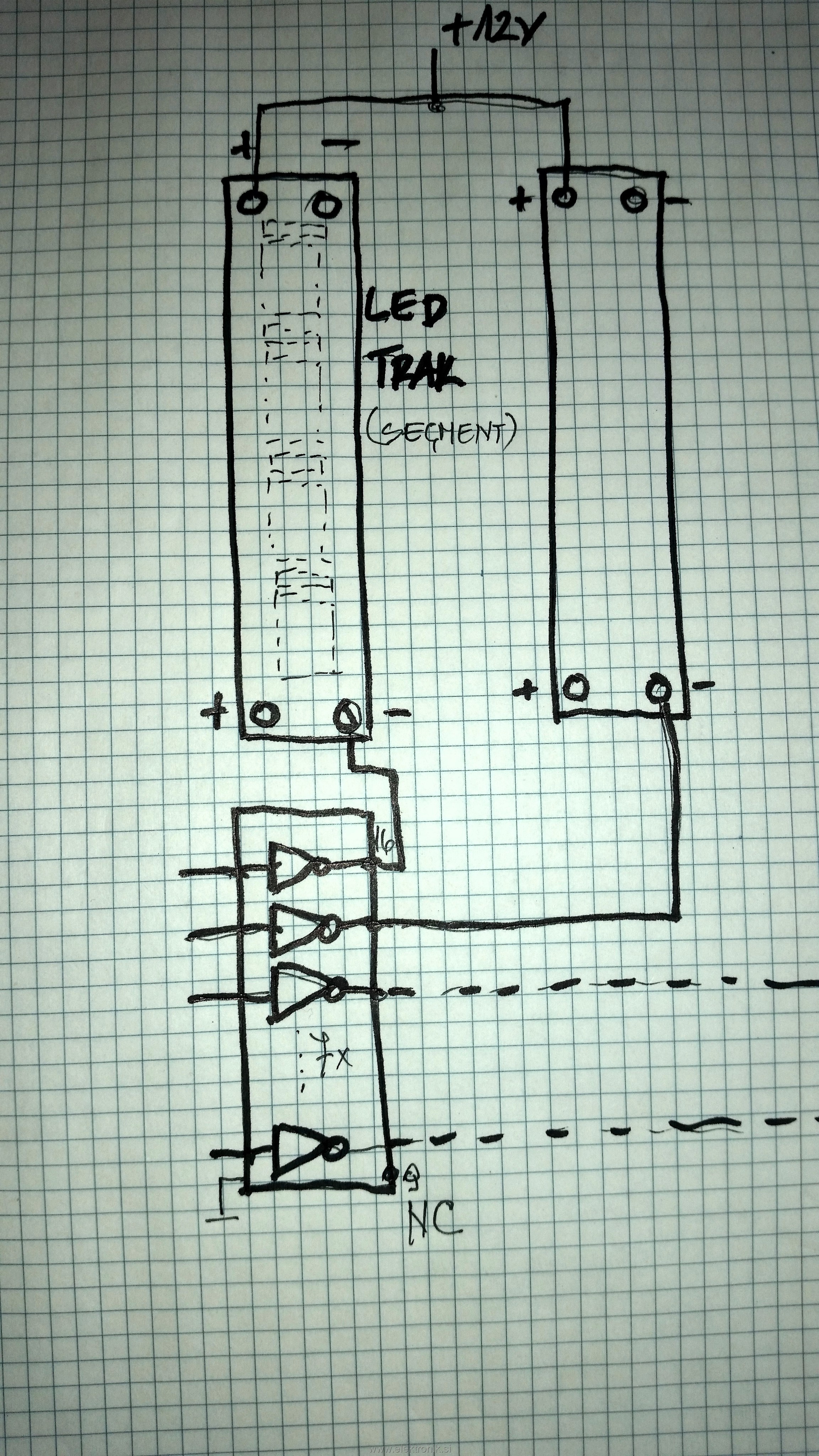 Pluse segmentov (LED trak) zveži skupaj in jih poveži na 12V, minuse posameznih segmentov pa poveži na kolektorje (izhode) ULNja.