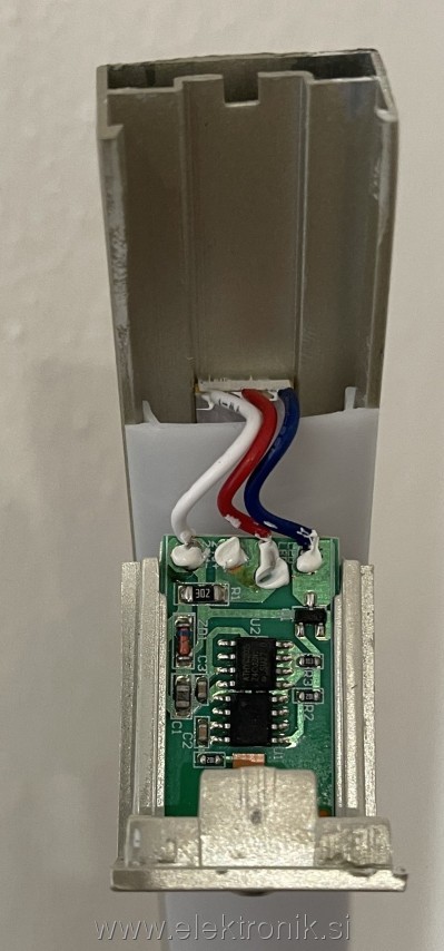 U2 je eeprom 24C02N, Q1 je mosfet (npr. AO3480) za vklop ledic, U1 pa nek namenski čip ali mikrokontroler. Še vedno pa ne najdem nobenega tipanja toka skozi led trak. Si pregledal led trak po celotni dolžini, da nima kje skritega upora ali več njih za omejitev toka?