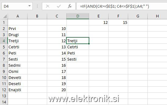 V stolpec D pa bi se nato izpisali priimki iz stolpca A, samo tisti ki so stari od 12- 15 let.